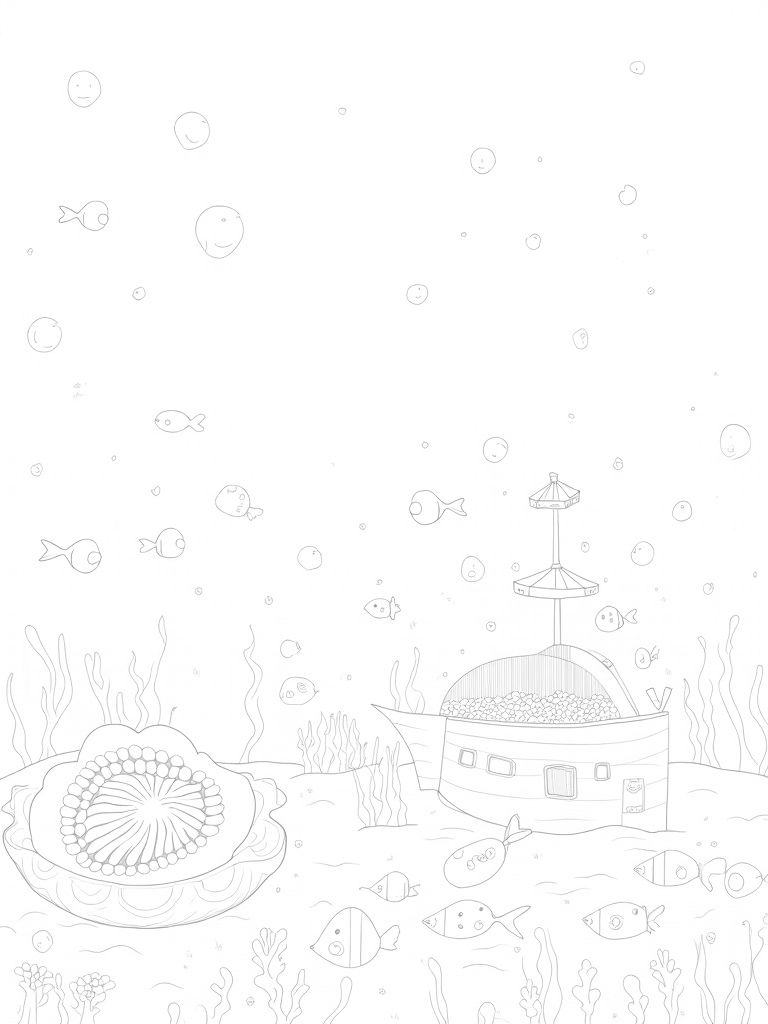 In the background, a sunken ship is covered in barnacles, giving it a mysterious vibe. Its portholes frame this vibrant underwater scene beautifully. Who knows what tales that ship could tell? Let your imagination run wild as you bring this underwater world to life with your favorite colors!