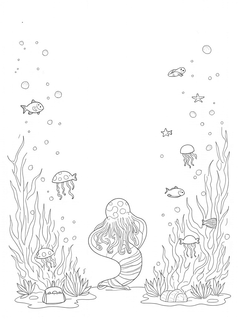 Underwater Garden with Giant Octopus and Colorful Jellyfish Coloring Page