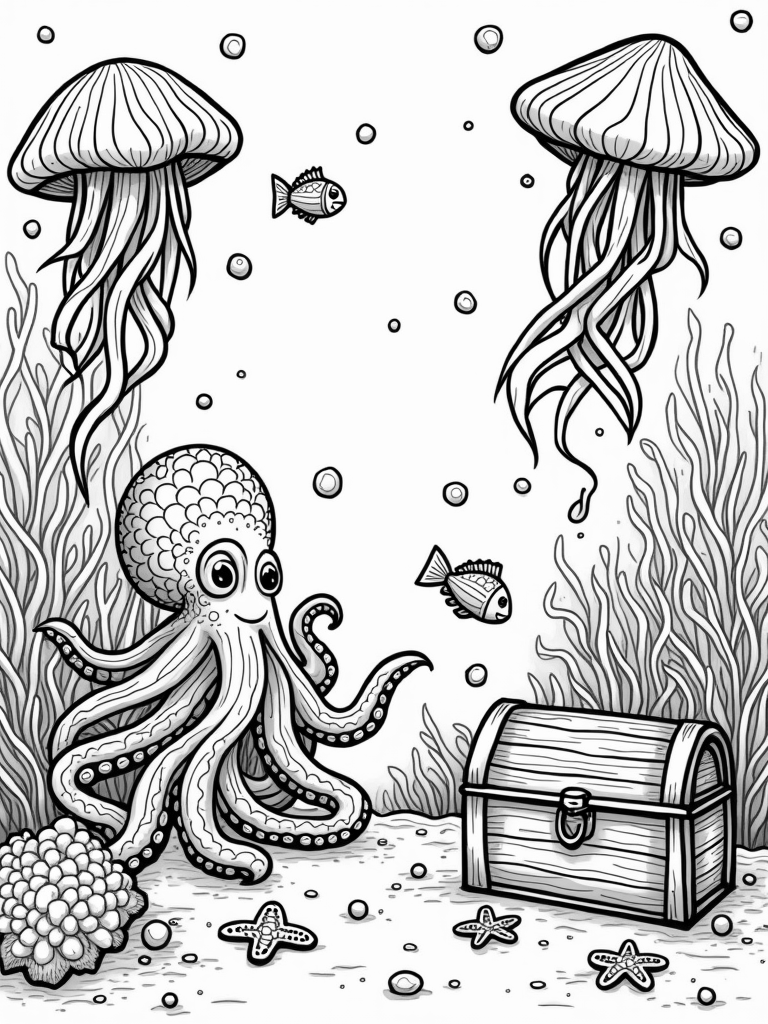 Check out this free printable coloring page featuring an underwater garden filled with a giant octopus, jellyfish, and hidden treasure! Perfect for kids who love animals and ocean adventures.