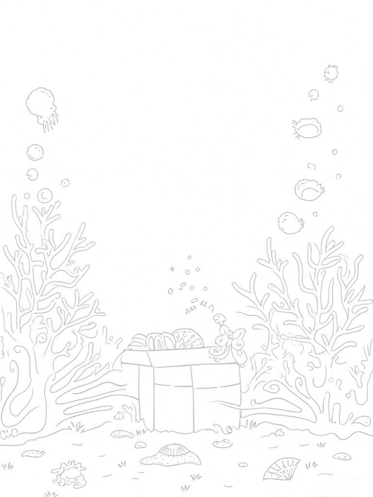Just above this bustling underwater world, bubbles rise toward a treasure chest that’s partially open, revealing sparkling jewels inside! It’s like the ocean is hiding its secrets and inviting you to discover them. The whole scene is filled with fun details, just waiting for your favorite colors to bring it all to life!