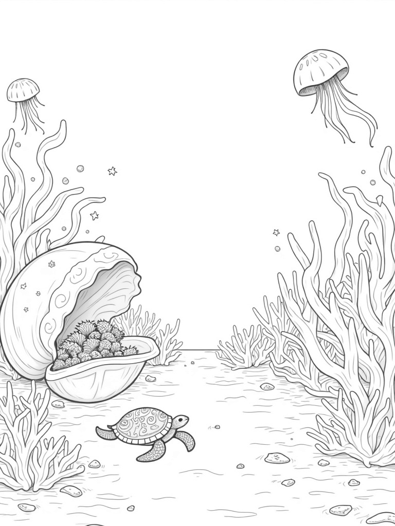 In this delightful underwater scene, you'll find a vibrant garden filled with colorful coral formations that twist and swirl like candy. Right in the foreground, an ornate seashell opens up to reveal a dazzling school of fish swimming out in a flurry of colors. Nearby, a gentle sea turtle glides effortlessly through the water, its shell adorned with intricate patterns that are just waiting for your creative touch.