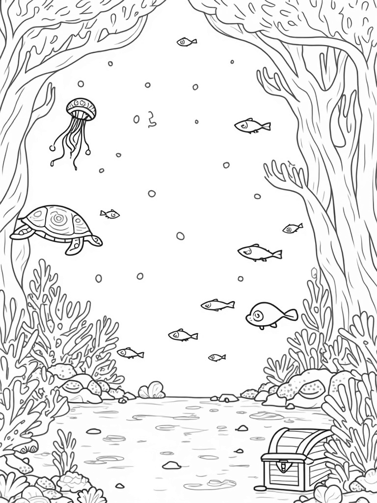 As you color, don't forget to pay attention to the jellyfish floating gracefully overhead. Their long tentacles swirl and twirl like ribbons in the water. And if you look down at the sandy floor, you’ll find all sorts of seashells scattered around, each one unique. Oh, and there’s a treasure chest peeking out from behind a coral structure, covered in barnacles! What do you think is inside?