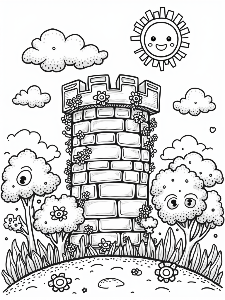 You’ll find a towering wall made of interlocking stone blocks, all dressed up in vibrant vines and colorful flowers. It looks like nature is having a party! In the foreground, there’s a bunch of whimsical trees with fluffy leaves that seem to sway in the breeze, making it feel alive and friendly.