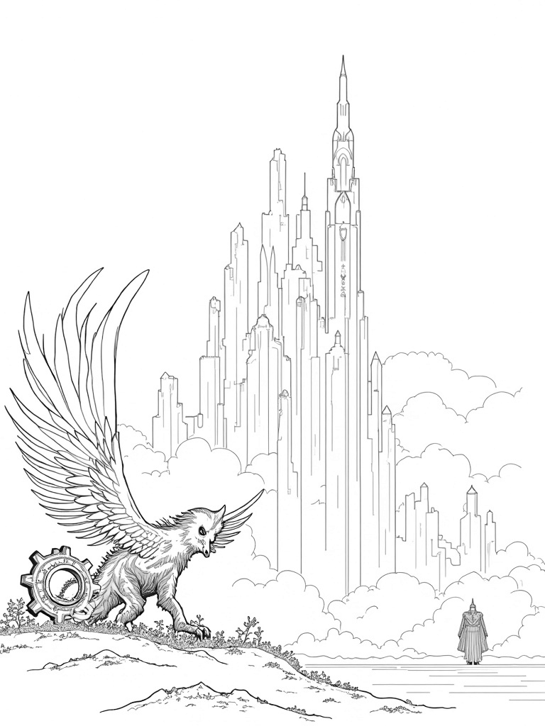 Colossal Cityscape with Giant Wings and a Titan Coloring Page