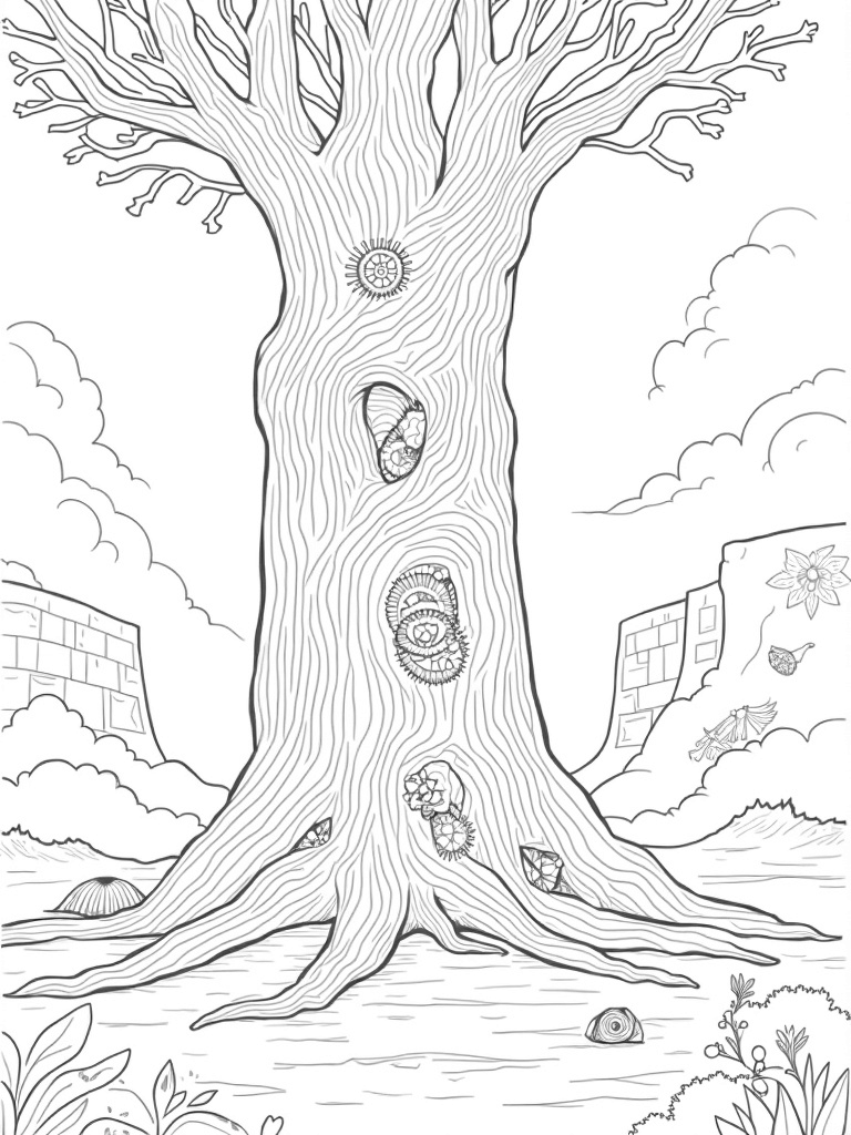 At the heart of this coloring page stands a massive, twisting tree that looks like it could touch the sky! Its trunk is decorated with huge gears and cogs that seem to keep a steady, rhythmic beat, giving it a unique mechanical vibe. Surrounding the base of the tree are giant feathers and broken arrows, creating a fascinating pattern on the ground. It's like a scene straight out of a storybook!
