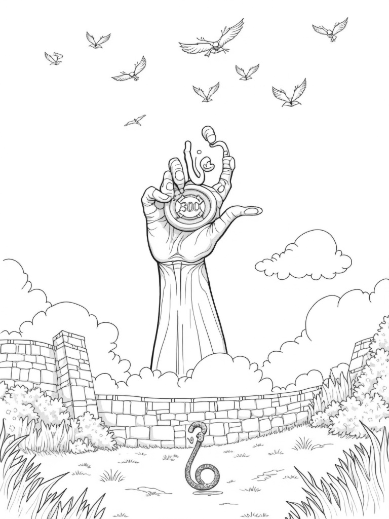 In the foreground, there's a weathered grappling hook suspended from a fluffy cloud, casting a playful shadow over a vibrant field of wildflowers. The sky is a fun mix of stylized birds, soaring high, resembling the wings of freedom. With all these details, you'll have a blast choosing colors and bringing this scene to life!