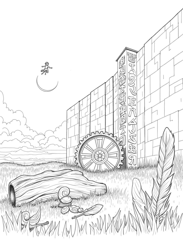 Above it all, there’s a mysterious figure flying near the wall, perfectly framed by a crescent moon. It adds a sense of wonder to the whole scene. There’s just so much to color and imagine here!