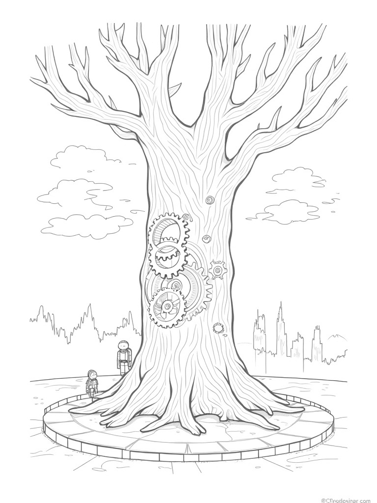 Colossal Tree Fortress with Gears and Cogs Coloring Page