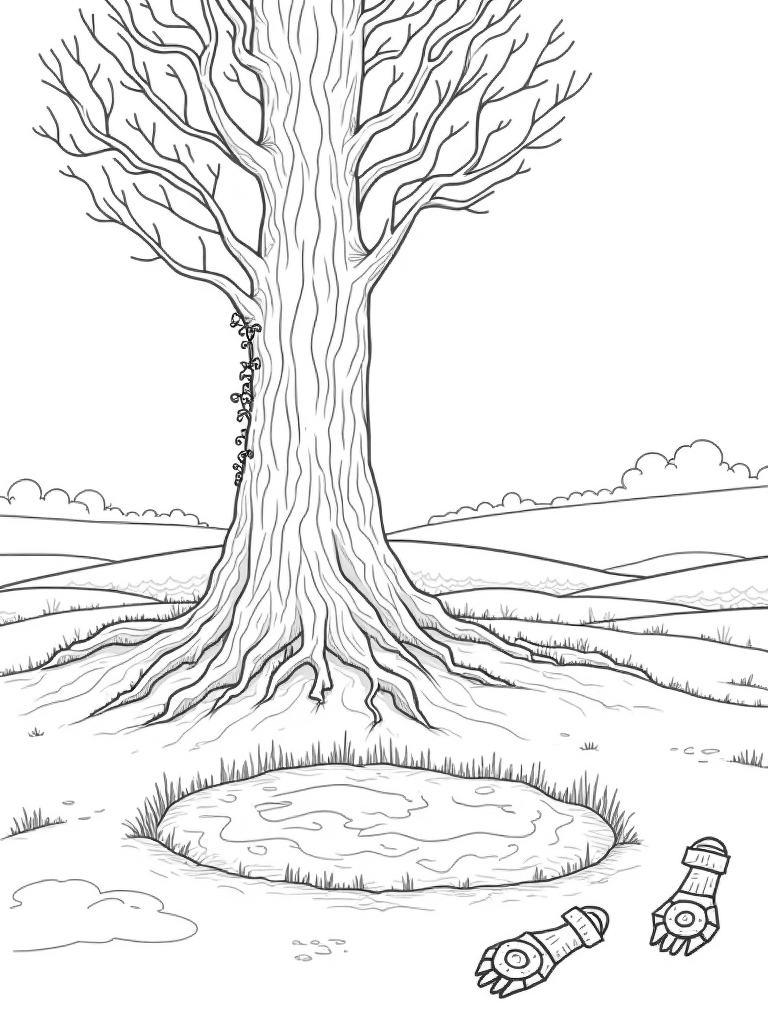 If you look closely, you’ll spot two enormous titan footprints nearby, leading off toward a horizon where fluffy clouds drift like soft shadows. It’s almost like you can hear the whispers of giants as you color in this magical landscape. What colors will you choose for the tree and the sky? It’s all up to you!