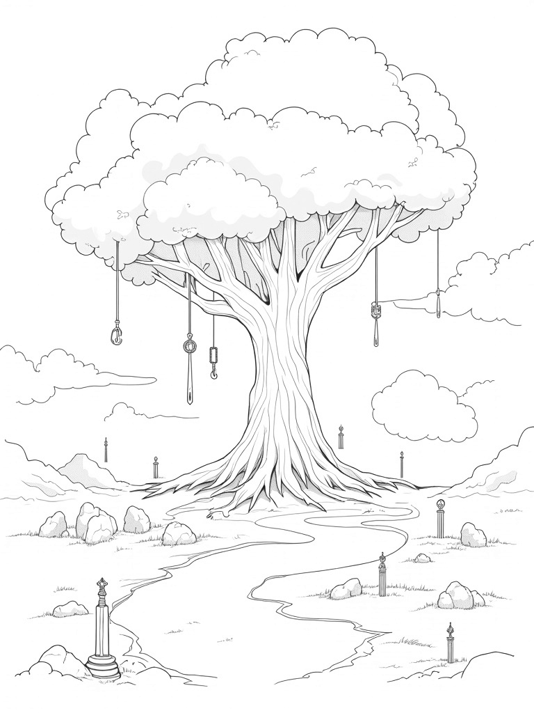Colossal Tree with Ancient Swords and Giant Clouds Coloring Page