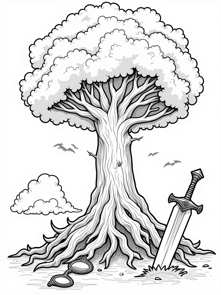 There’s a lot to keep you busy with your crayons here! Imagine coloring the tree’s bark with shades of brown and adding greens for the leaves. The giant broken glasses reflect the whole scene, so you can get creative with what colors to use there. And don't forget the oversized sword standing proudly in the ground—what colors will you choose for its blade?