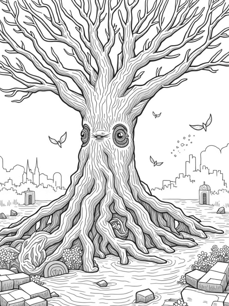 Colossal Tree with Titan Faces and Floating Feathers Coloring Page