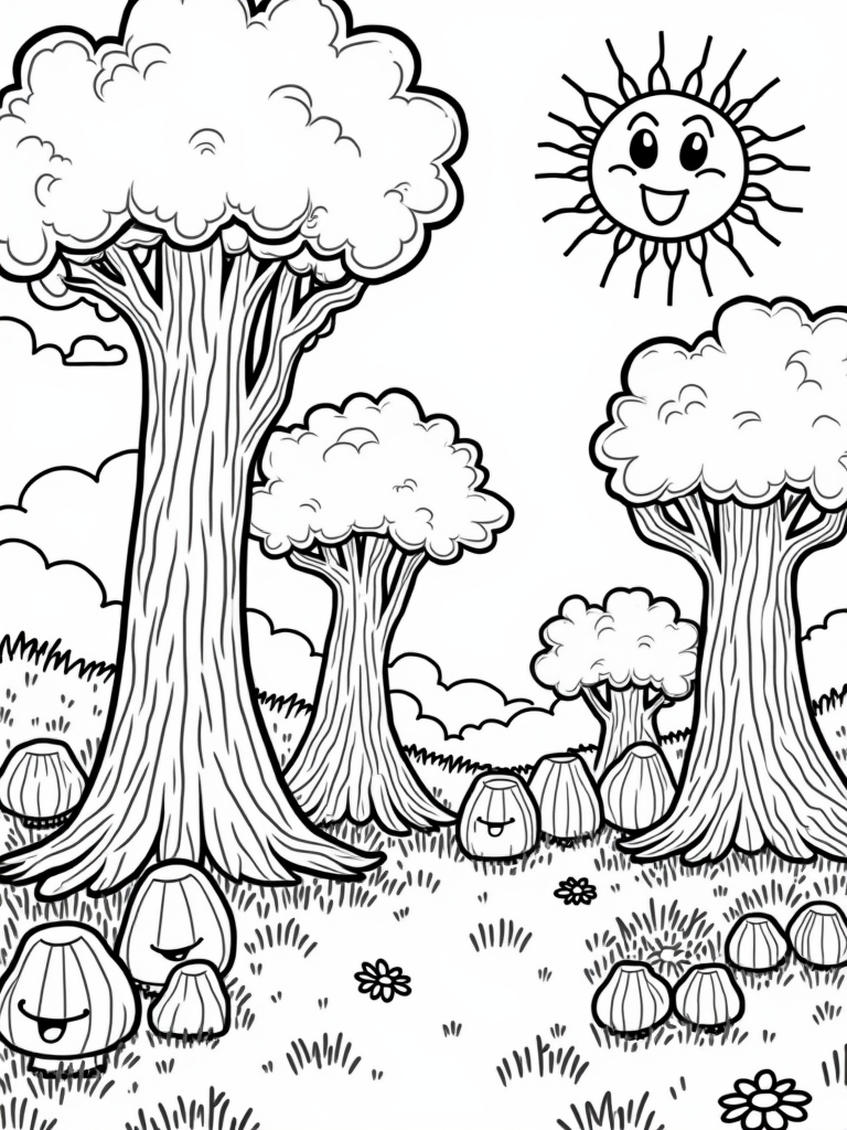 In this enchanting scene, you'll find enormous trees with spiraling trunks that stretch all the way up to the clouds. Their branches are adorned with giant, colorful leaves shaped like shields, making it look like a magical fortress in the sky. Peeking out from the foliage are friendly giants, each with a big, welcoming smile, ready to invite you into their world.