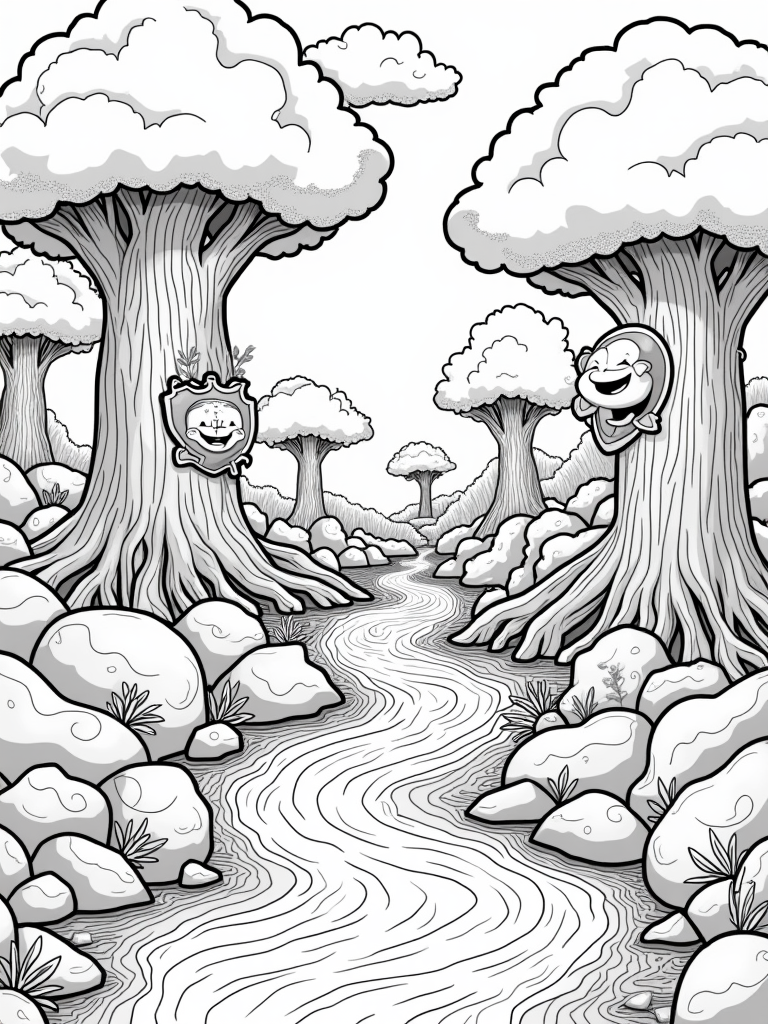 Imagine a world filled with gigantic trees that have leaves shaped like shields! In this enchanting landscape, friendly titans peek out from behind the branches, their big, goofy smiles making it hard not to giggle. Below them, a sparkling river winds its way through the scene, where happy fish leap over rocks that look like tiny castles. It's a playful place where nature and imagination collide.