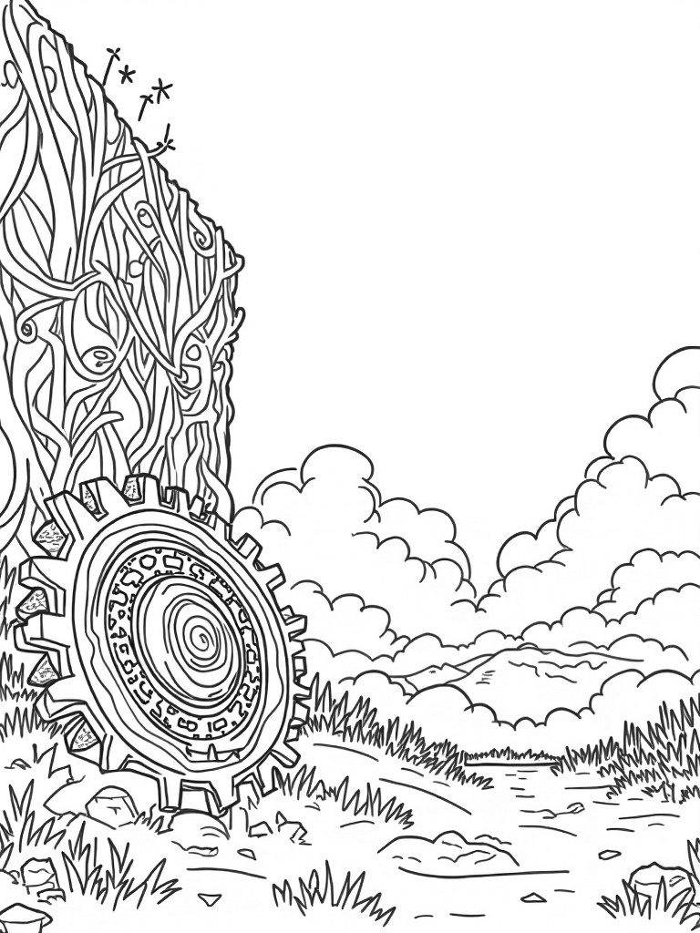 There’s so much detail to explore in this coloring page! The giant gear can be colored in metallic shades or bright colors to make it pop against the green grass. The wall of branches can be any shade you like, from earthy browns to vibrant greens. Imagine the giants—do you want them to be friendly or a bit spooky? You get to decide!