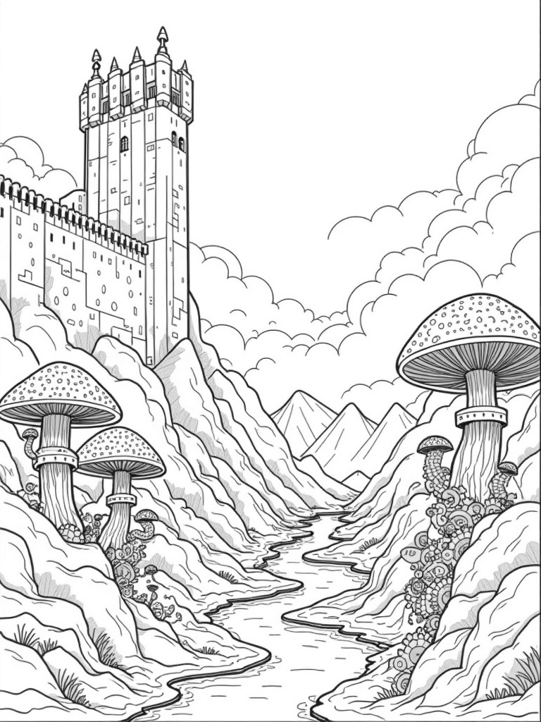 Looking to the background, wispy clouds swirl around distant peaks, giving the entire illustration an ethereal glow. It’s like stepping into a fantastical realm where imagination knows no bounds. Grab your favorite coloring tools and bring this scene to life!