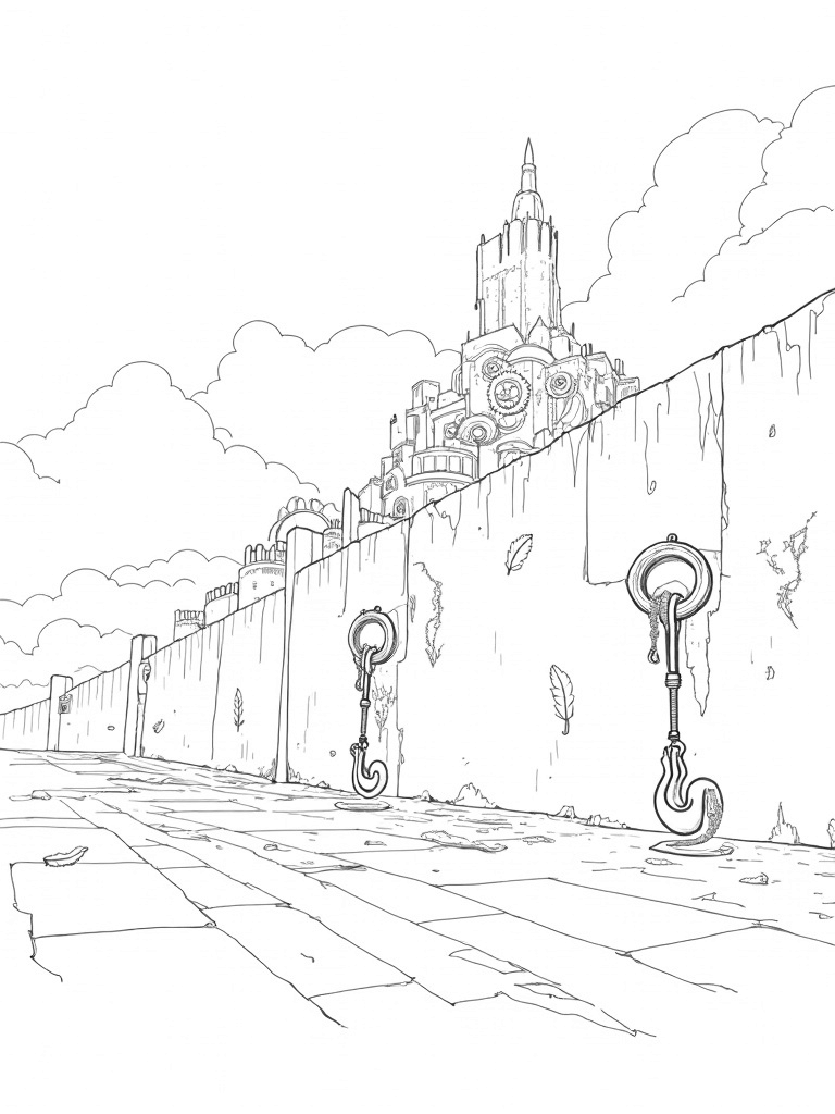 At the base of the wall, you’ll find oversized feathers and broken arrows scattered across the cobblestone streets, adding a touch of mystery. In the foreground, a series of steam-powered grappling hooks dangle from rusty chains, inviting your imagination to run wild. Each element is designed with clean lines, making it easy for kids to jump in with their favorite colors and bring this adventurous scene to life.