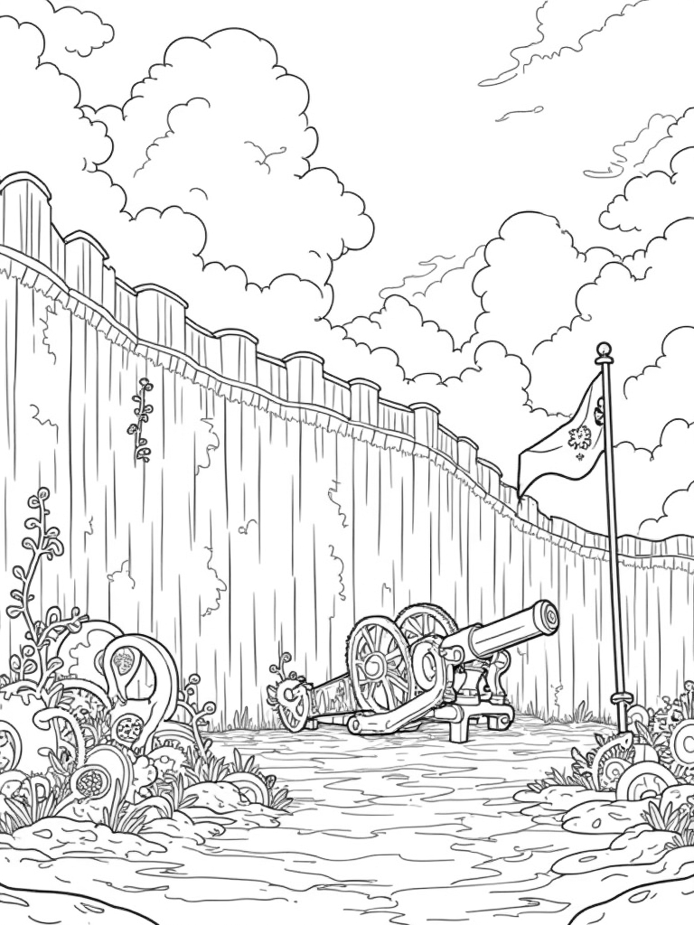 In one corner, there’s a broken cannon leaning at an angle, with moss creeping up its sides. A tattered flag flutters nearby, featuring a mysterious emblem. These little details invite creativity, allowing kids to add their own flair and colors to every inch of this illustration.
