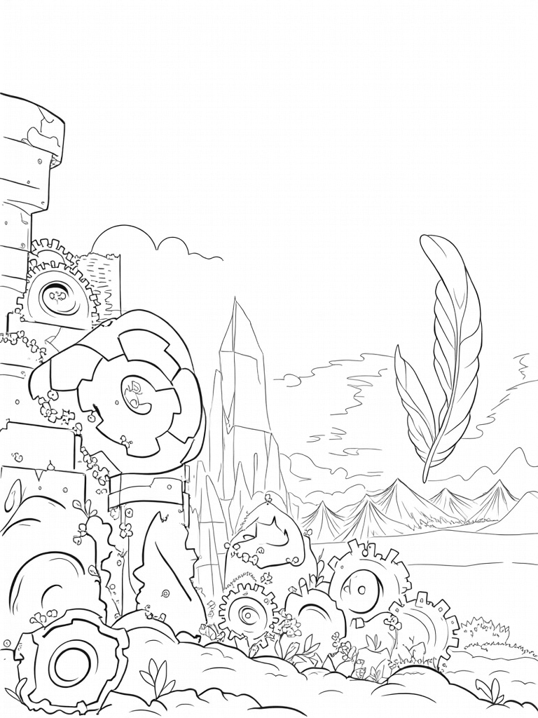 Crumbling Wall with Giant Feathers and Gears Coloring Page