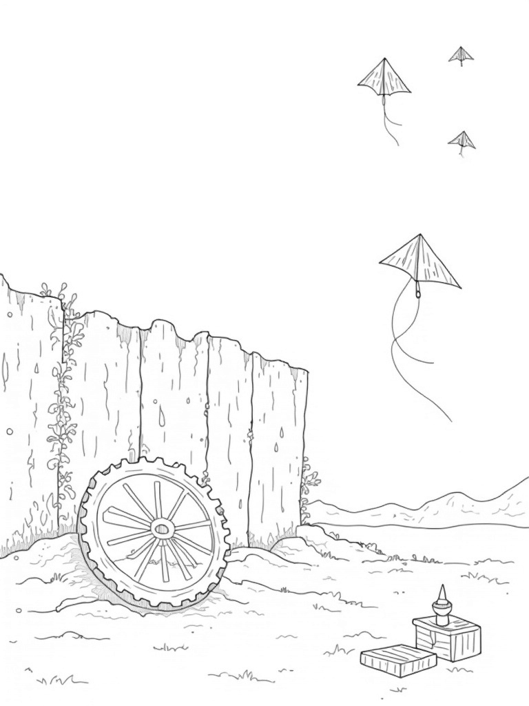 Crumbling Wall with Giant Gear and Flying Kites Coloring Page