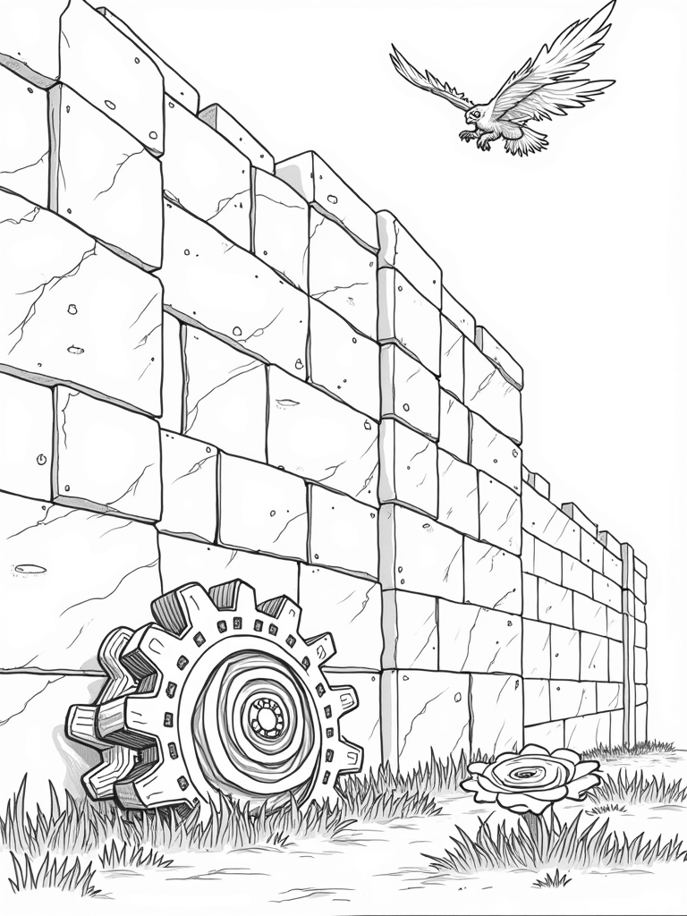 You’ll find a massive stone wall towering above, made of gigantic blocks that are all dressed up with intricate patterns. Vines peek out from between the stones, adding a touch of nature to this impressive structure. Right in front, there’s a colossal gear, half-buried in wild grass, glinting in the sunlight like it’s ready to spring into action. And let’s not forget those huge wings—half metal, half feather—floating above like they own the sky!
