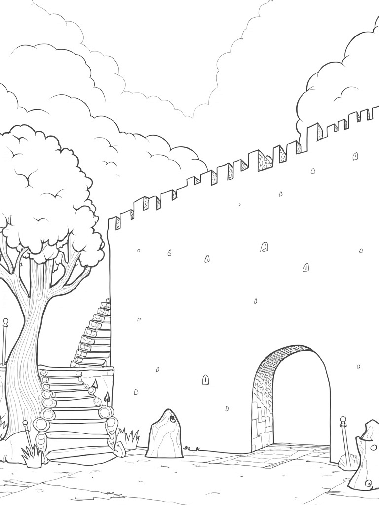 This scene captures a massive, crumbling city wall standing tall, with swirling clouds creating a dramatic backdrop. Towering trees with twisted trunks add a mystical feel, their branches wrapping around the stone as if they're part of the wall itself. Below, a spiraling wrought iron staircase leads down into a mysterious courtyard, where oversized gears and broken swords lay scattered, hinting at a long-forgotten battle.