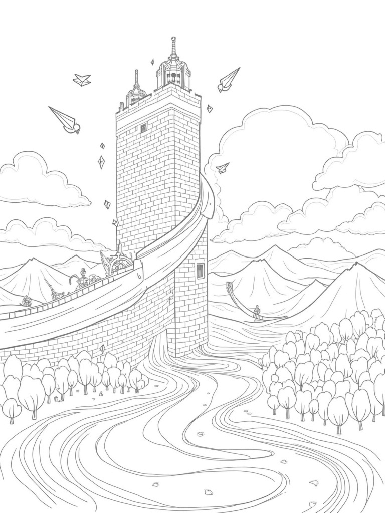 This coloring page showcases a colossal, winding wall that seems to stretch into the sky. Its intricate brick patterns invite you to add your own splash of color. On top of the wall, oversized blades and gear mechanisms hint at a fierce battle that once took place. What colors would you use to bring this epic scene to life?