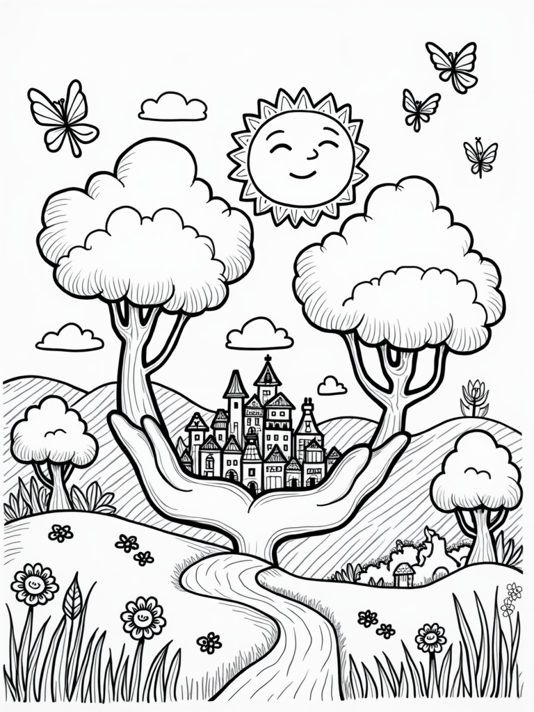 In this cheerful scene, towering giants made of fluffy clouds are having a fun time playing with oversized trees. They look so friendly, almost like they’re inviting you to join in! In the foreground, a giant hand is gently cradling a tiny village filled with colorful houses. Each house has a vibrant rooftop and winding paths that look like they’re just asking to be colored in.