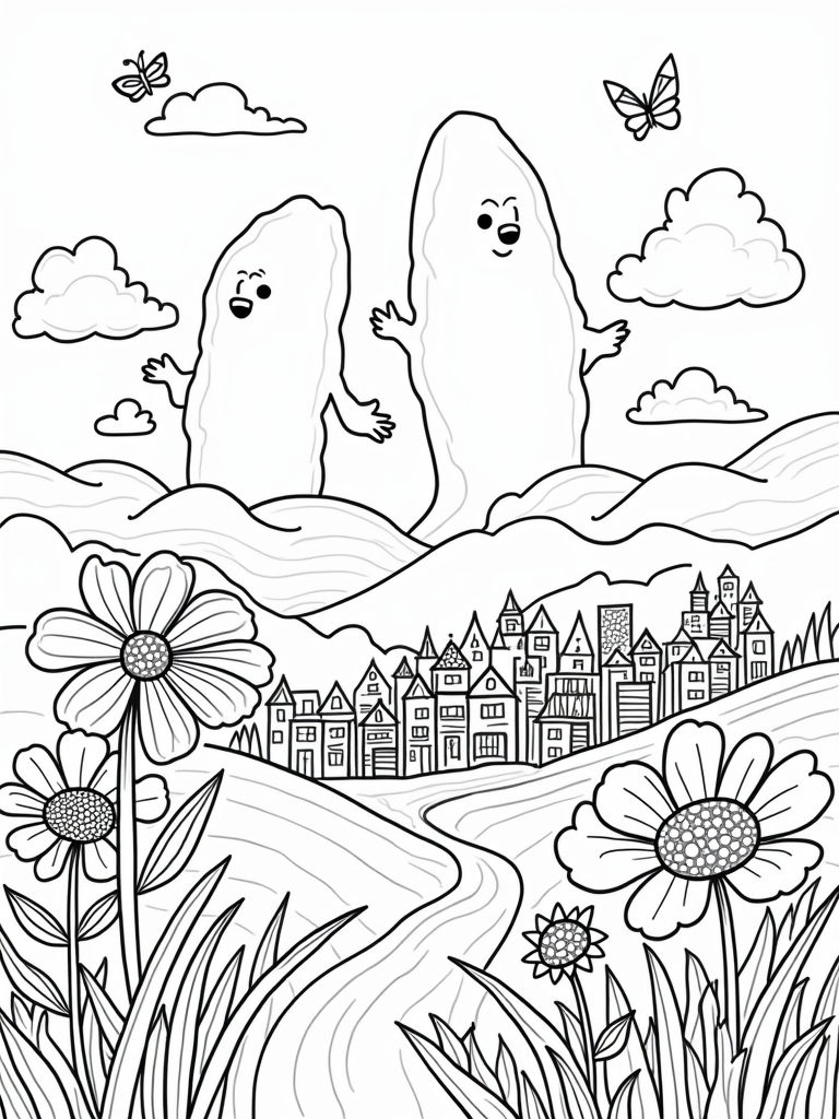 A sparkling river winds through the landscape, reflecting the bright sun above. Playful butterflies dance from flower to flower, their wings showcasing cheerful designs. This scene is not just about coloring; it's an invitation to bring this joyful world to life with your choice of colors!