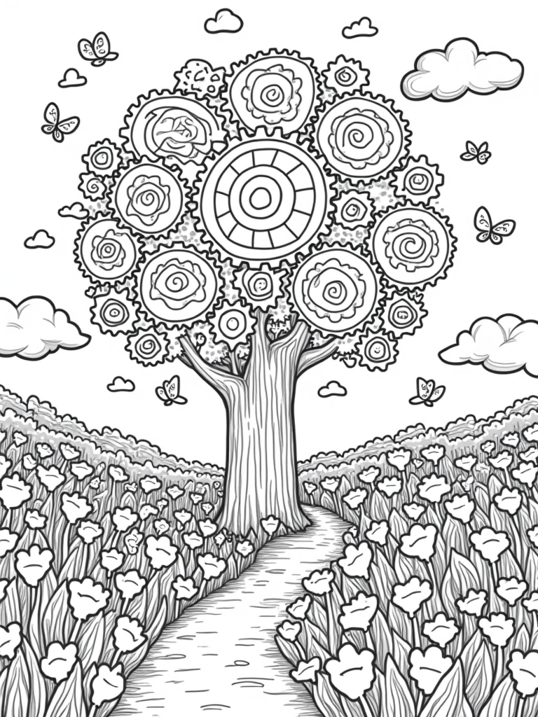 Friendly Flying Gears and a Colorful Meadow Coloring Page