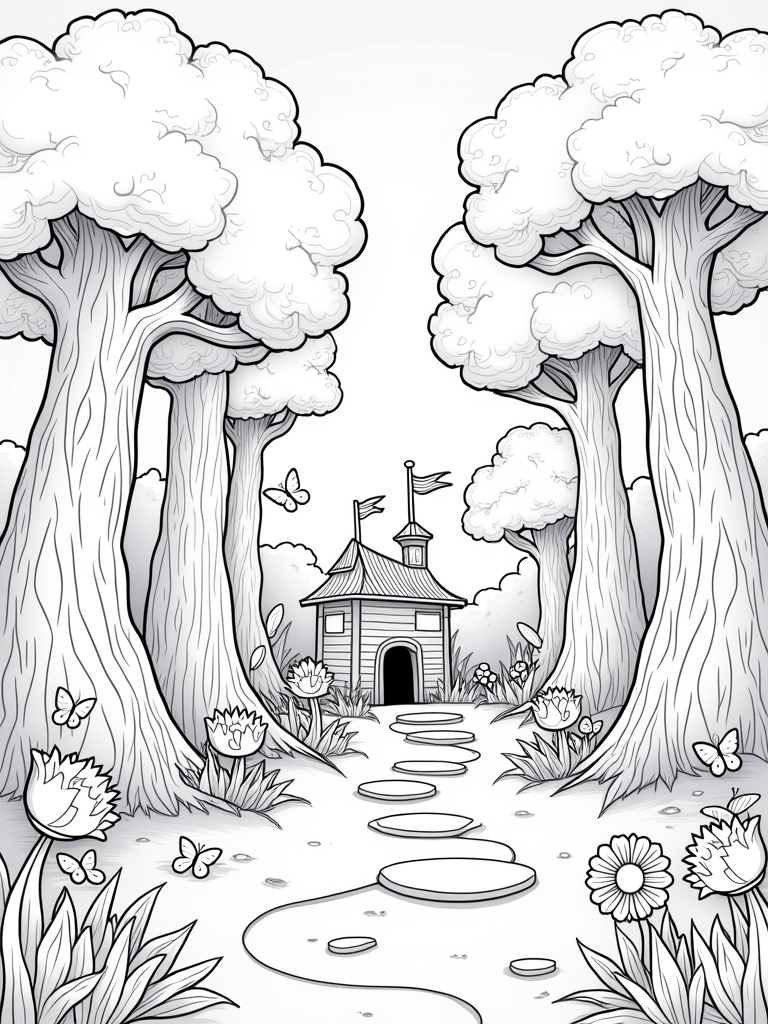 This coloring page showcases a magical forest filled with oversized trees that twist like spirals. These friendly giants have branches adorned with playful paper lanterns shaped like mini titans, adding a touch of whimsy as they glow softly. At the base of the trees, you'll find giant flowers with smiling faces, surrounded by sparkling butterflies that flutter about.