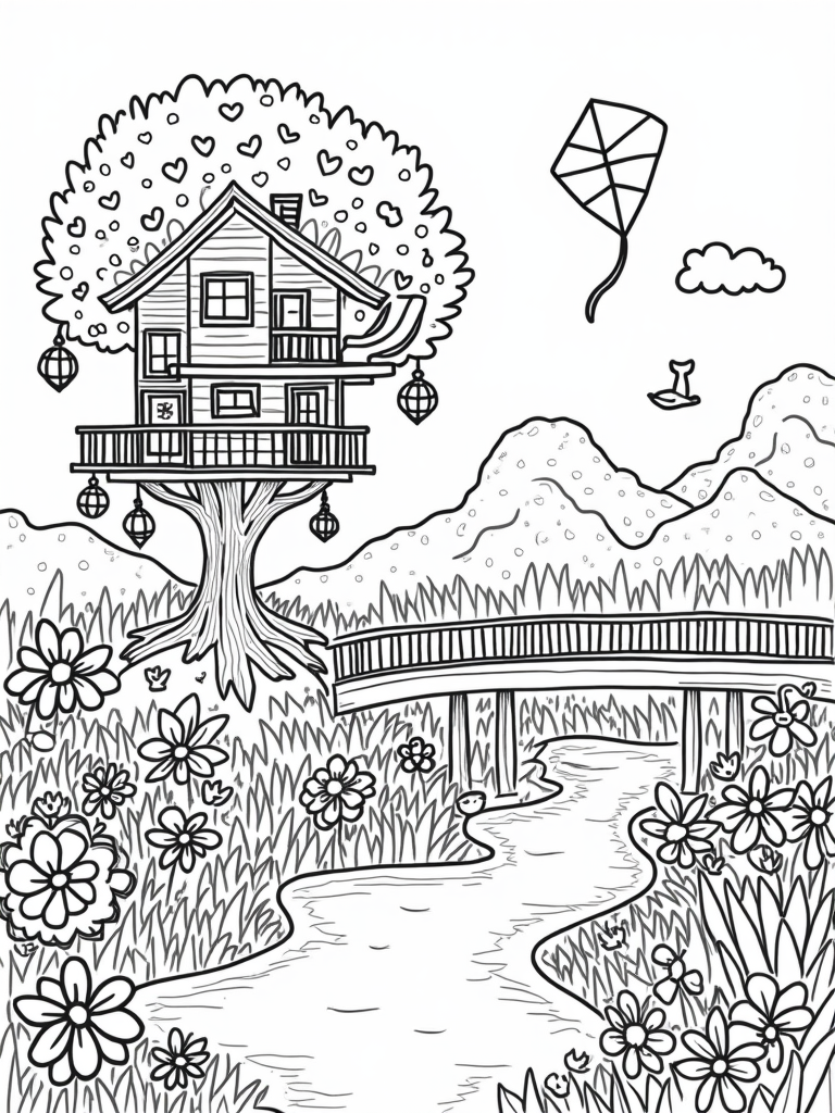 Surrounding the treehouse are oversized flowers bursting with bright colors and funky patterns, just waiting for your favorite shades! Kites shaped like whimsical creatures flutter through the air, adding to the playful vibe. A winding river flows gracefully through the scene, reflecting the soft, fluffy clouds above. And don’t miss the magical bridge made of giant leaves that connects two hills, creating a perfect spot for delightful daydreams.