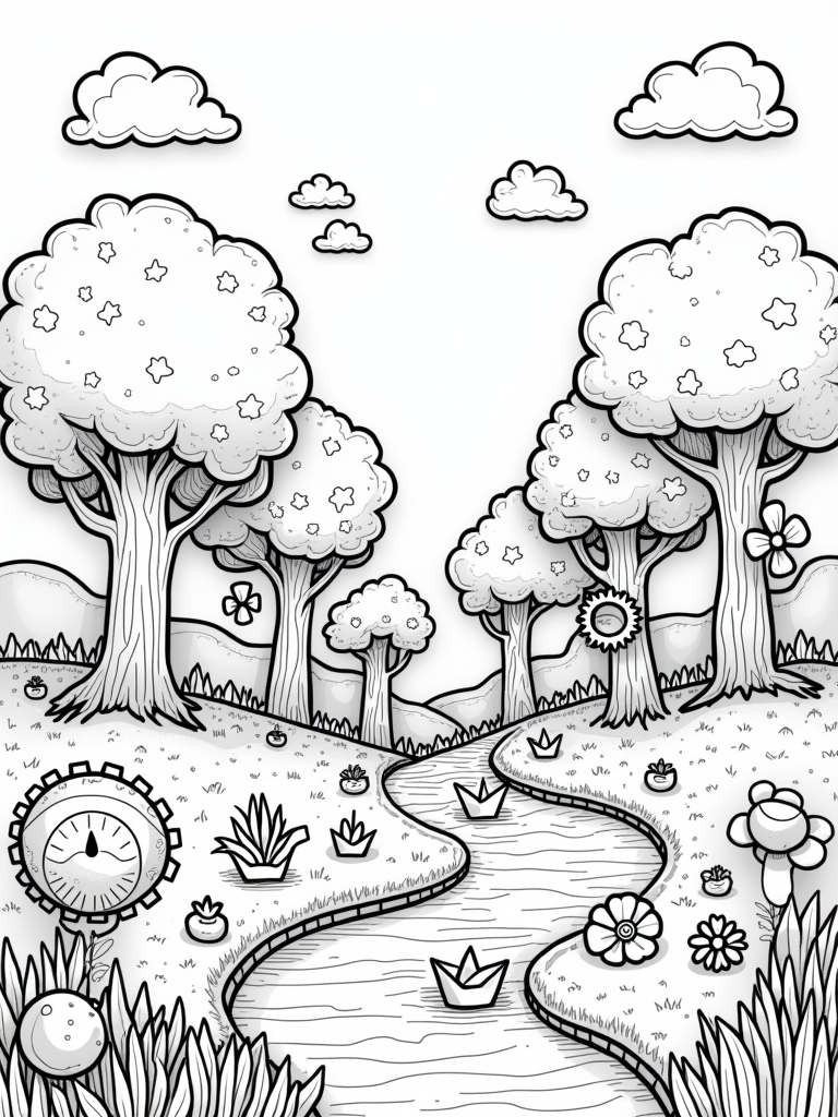 Imagine a world where giant, friendly titan trees tower over you, their leafy canopies inviting you to play in the shade. Below them, colorful gears spin gently in the breeze, adding a fun, whimsical touch. A winding river flows through the scene, dotted with adorable paper boats that look like mini walls, just waiting to float away on a sunny day.