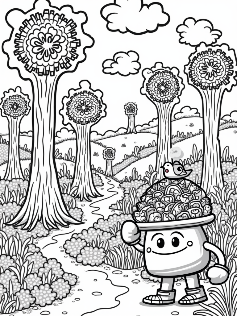 Picture a forest where the trees look like giant gear wheels, their branches twisting playfully into the clouds above. It’s a magical place filled with oversized scout regimens peeking from behind bushes, each dressed in their own unique patterns and vibrant colors. They seem to be having a great time just waiting to be colored in!