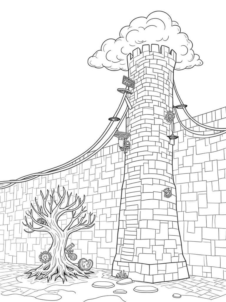 Gears and Giants: The Towering Wall Scene Coloring Page