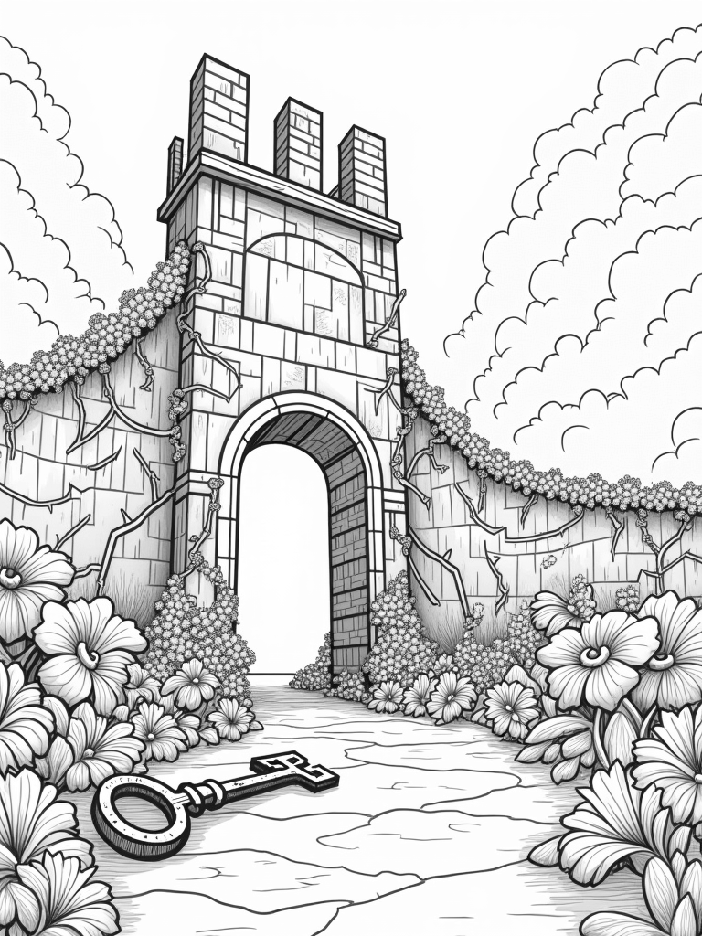 Look up at the swirling clouds in the sky! They hint at some distant titans, casting shadows that make you feel like you're part of an epic story. And don’t miss that giant key lying at the base of the wall – its teeth are designed to resemble battlements, adding an extra layer of mystery to this enchanting scene.