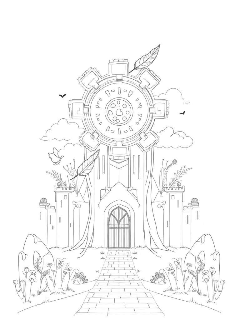 Giant Gear Fortress with Vines and Poppies Coloring Page