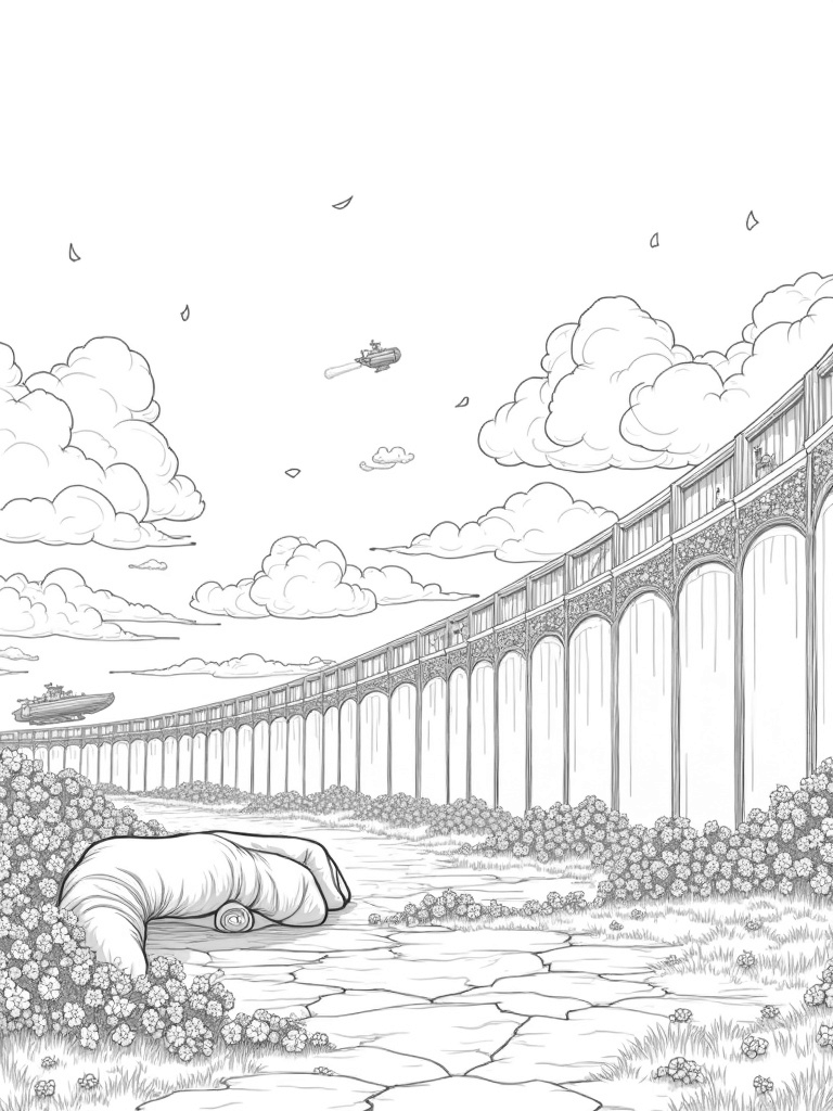 Look up and you’ll see clouds shaped like titans floating by! One enormous titan is snoozing in the background, giving off a sense of calm while the scout regiment airship sails high above, leaving a trail of smoke that curls into spirals. It’s a blend of wild nature and towering figures, and there’s so much to imagine as you color.
