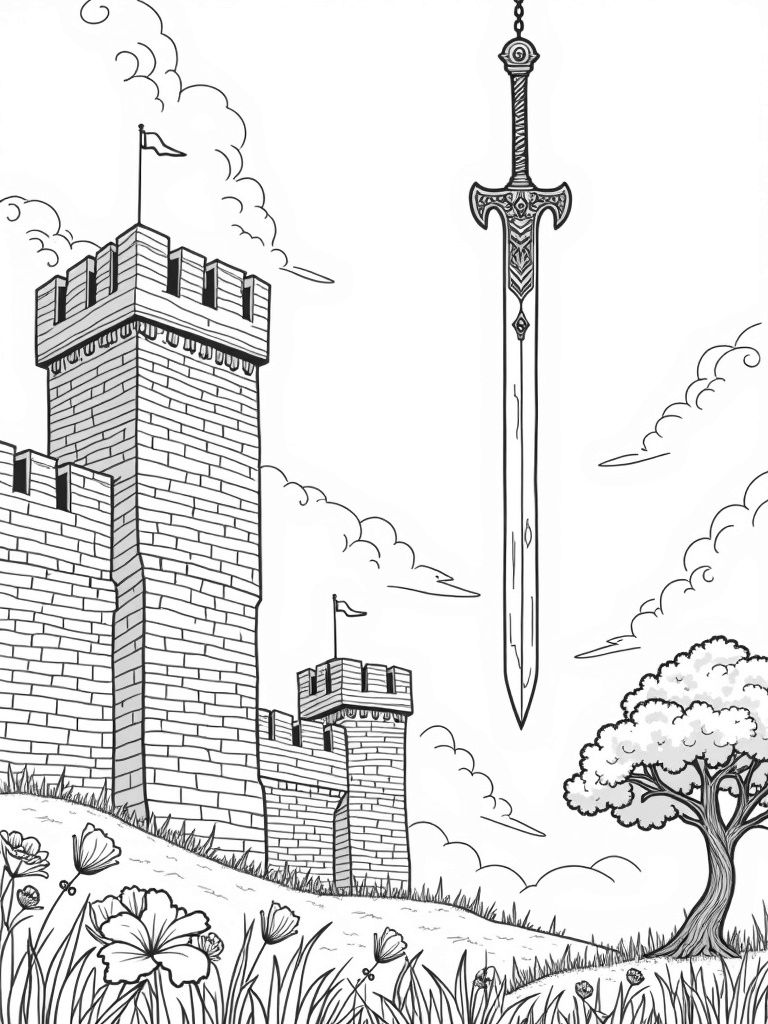 Giant Sword and City Wall with Wildflowers Coloring Page