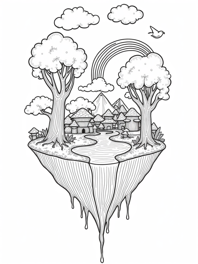 Check out this free, printable coloring page featuring a giant titan's hand cradling a colorful village! Perfect for kids who love imaginative scenes. Bring this whimsical floating island to life with your favorite colors. Enjoy hours of creative fun!