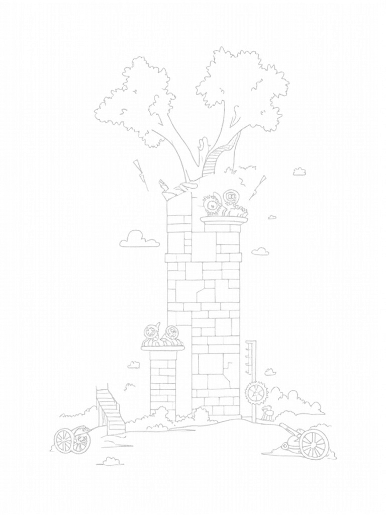 On the ground, you’ll spot some oversized, rusty cannons pointed towards the horizon. These aren’t just for decoration – they look like they’ve seen a lot of action! Plus, there’s a winding staircase that spirals around the wall, leading to a lookout platform. Just imagine standing up there and taking in the view! The whole scene is filled with intricate details that make it perfect for coloring.