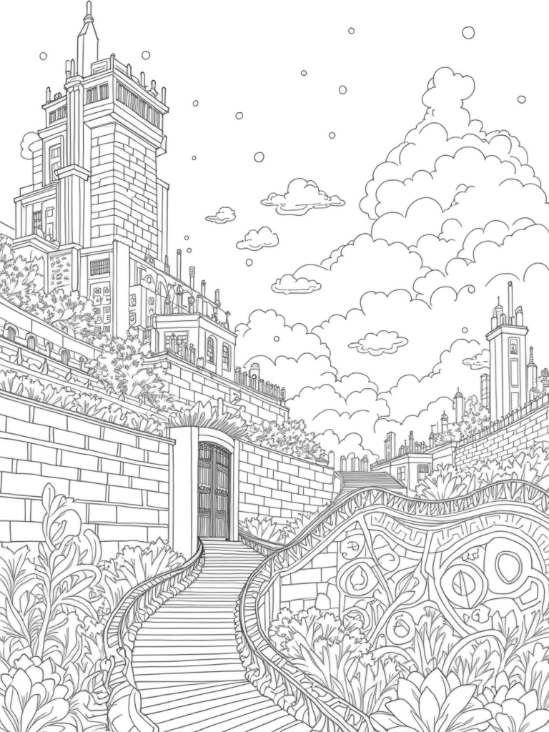 This coloring page showcases a stunning, towering wall made of intricate stone bricks that stretches across the horizon. It's not just any wall, though; it’s adorned with beautiful vines and wildflowers, making it look like nature and architecture are in a friendly hug. At the bottom, you can spot giant metallic gears and cogs that add a steampunk vibe, all rusted yet still impressive.