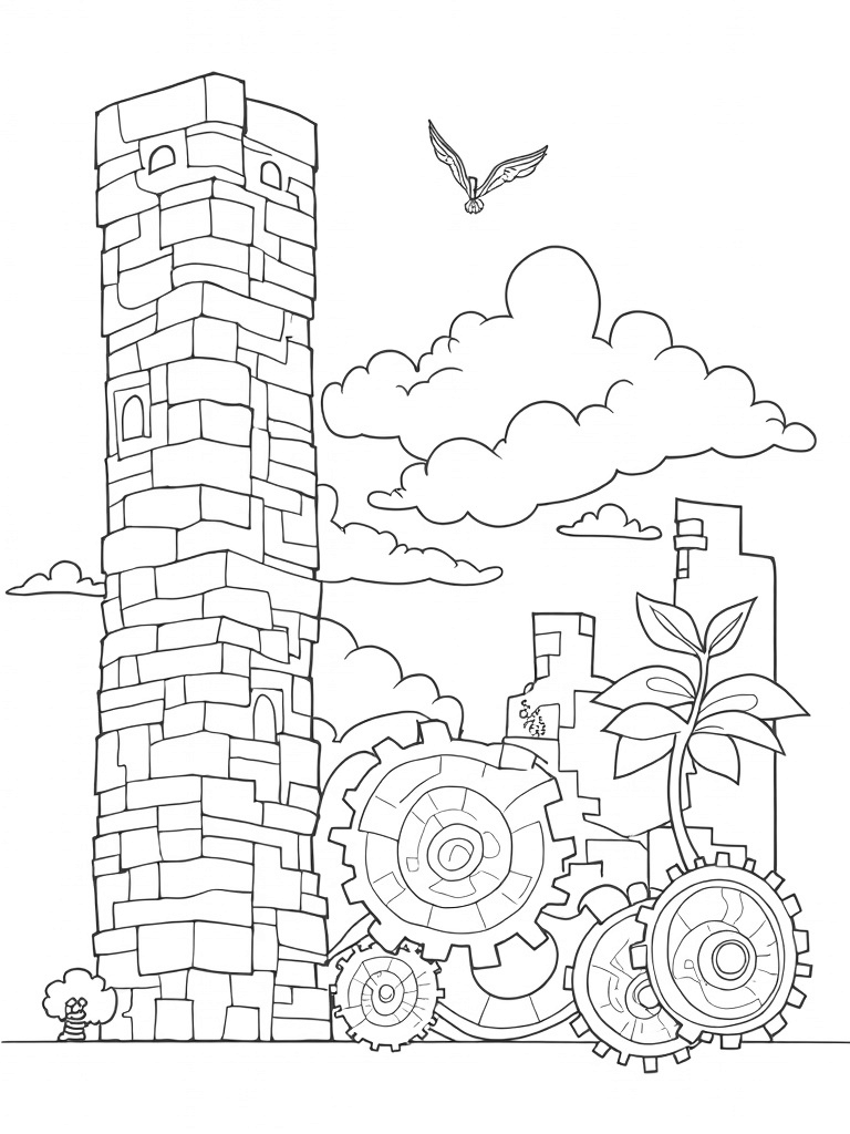 Intricate Stone Wall with Spinning Gears and a Mighty Tree Coloring Page