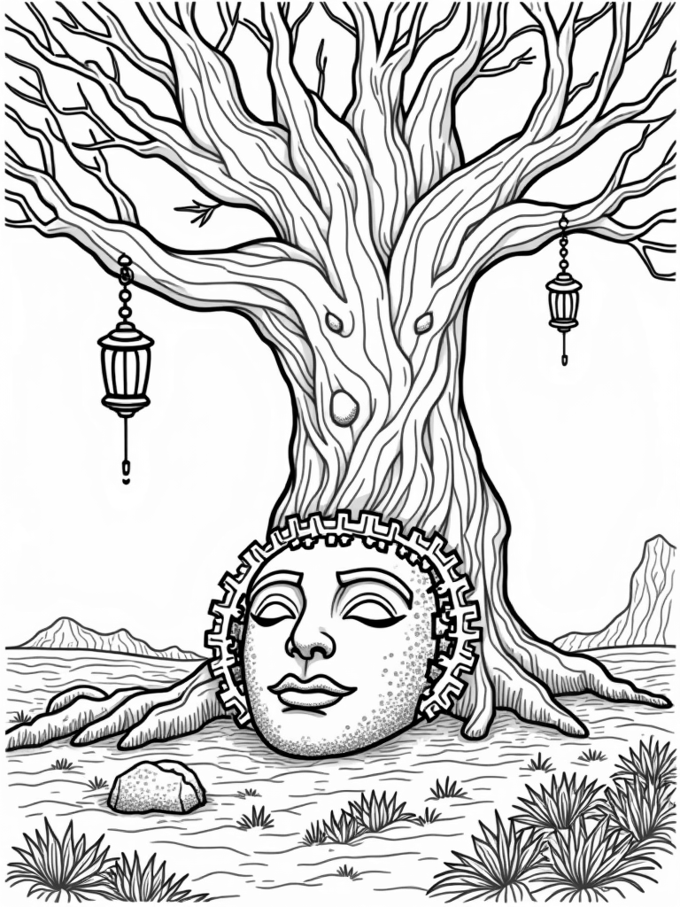 Majestic Tree with Lanterns and Gears Coloring Page