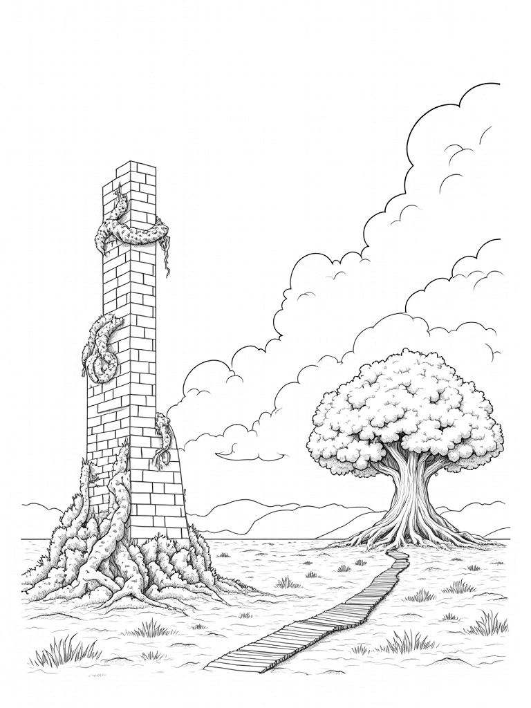 Mysterious Gear and Ancient Wall with Vines Coloring Page
