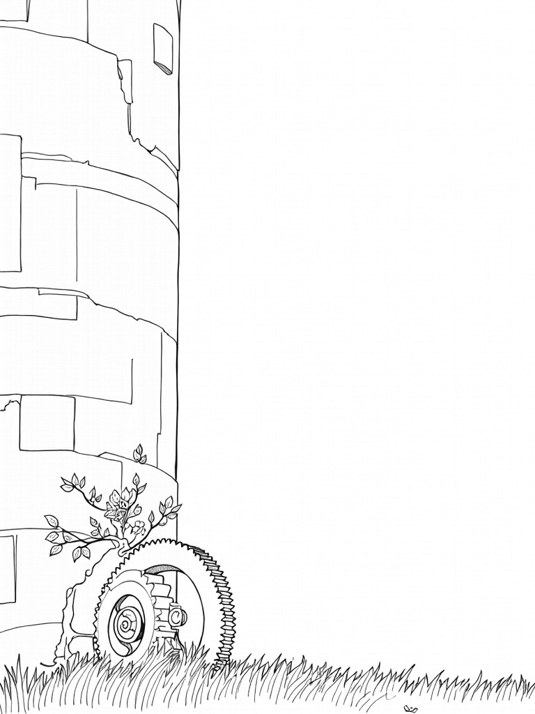 Imagine a giant wall spiraling up into the sky, covered with cool carvings of mythical creatures! In the foreground, there's a massive gear hiding in the grass, hinting at a forgotten machine. It’s fascinating to think about what that old mechanism could have done!