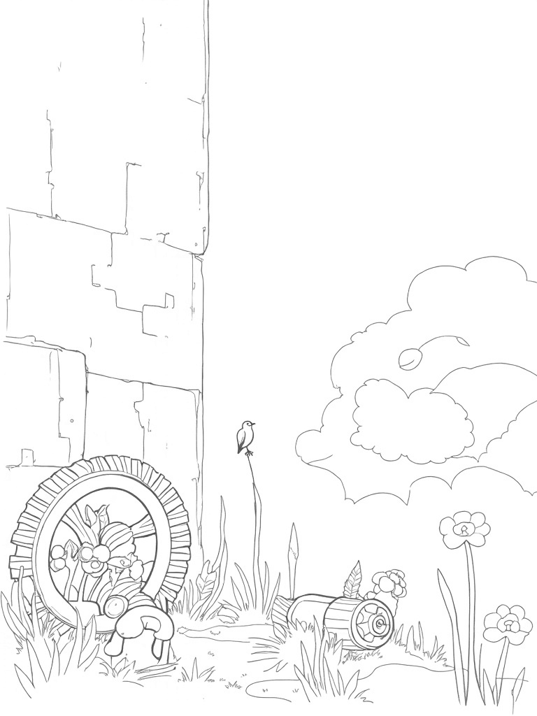 This scene is all about a massive wall in the background, covered in detailed carvings of mythical creatures. It’s like a giant storybook come to life! In the foreground, there’s a huge gear from an old machine, resting in some wild grass. The rusted gear is tangled up with pretty wildflowers, adding a splash of color. Nearby, a broken cannon peeks out from the ground, wrapped in vines, which gives it an enchanted look.