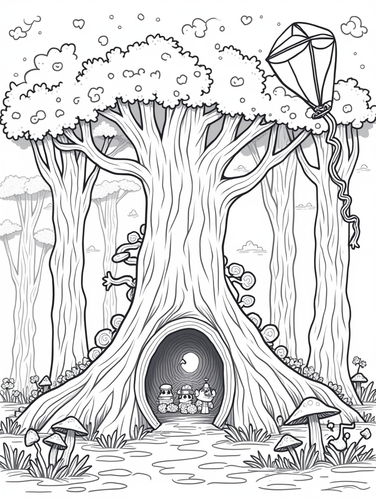 Right at the base of one of those enormous trunks, there’s a circular stone portal. It's covered in playful carvings, just waiting for you to add your artistic flair. When you color it, picture what lies beyond—an enchanting candy-colored world filled with oversized mushrooms and friendly critters peeking out to say hello!
