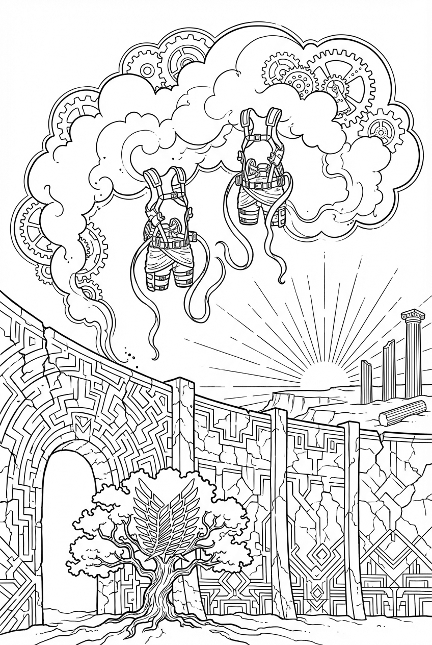 Look up and you’ll spot a massive stone wall sweeping across the horizon, its cracks weaving into a maze‑like pattern. Above it, a huge cloud outline rolls into the sky, its shoulders dotted with floating cogs that look ready to turn. Hanging between the clouds are two stylized harnesses, their straps looping like ribboned ornaments. Down at the base, an ancient oak spreads its branches into little survey‑corps symbols, while a sunrise pours golden light over a quiet plateau peppered with broken marble pillars.
