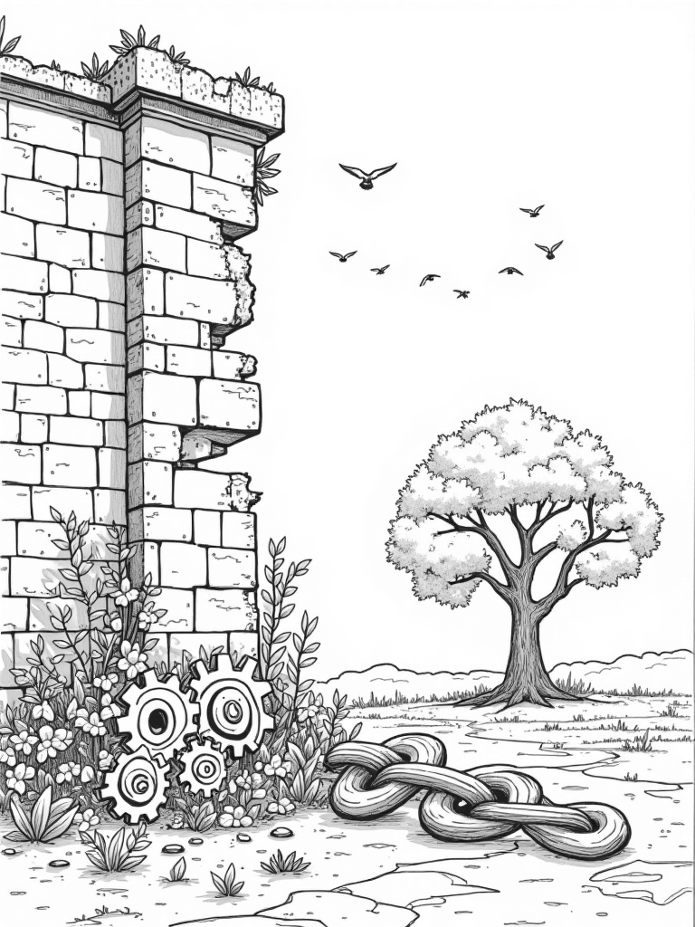 This scene shows a massive, crumbling wall looming over a wild, overgrown landscape. Vines are creeping through the cracks, adding a touch of nature to the tough stone. You can also spot giant gears that seem to tell a story of a long-gone time, partially buried in the ground. In the foreground, there's a colossal tree with branches that twist and curl like giant arms, creating a sense of awe.